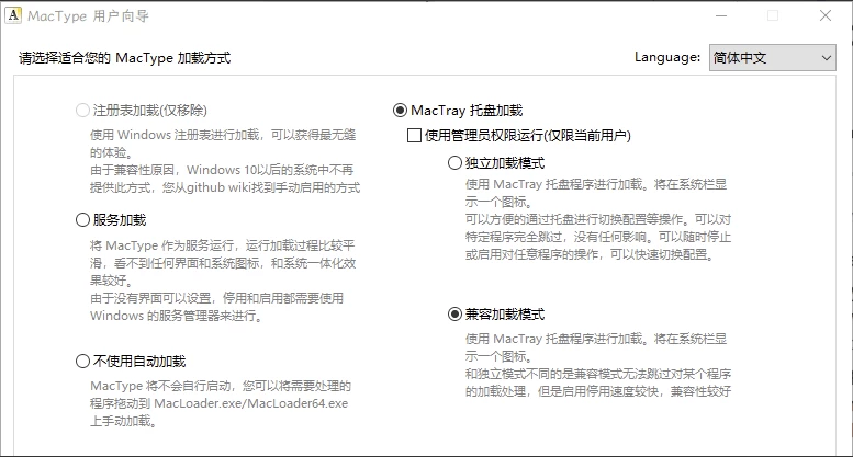 - 兼容加载模式:使用MacType托盘程序进行加载,将在系统栏显示一个图标,和独立模式不同的是兼容模式无法跳过对某个程序的加载处理,但是启用停止速度较快,兼容性较好