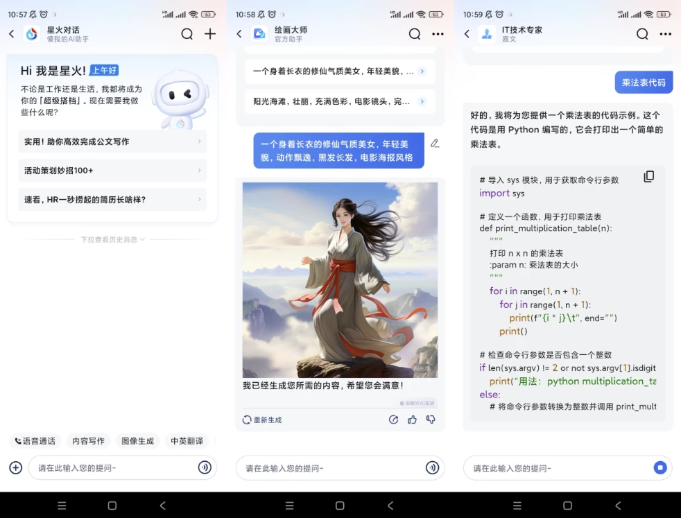 讯飞星火是一个chatGPT国产大模型,讯飞星火ai生成软件可以帮助ai人工智能写作、ai绘图等等,除了免费功能还有很多的专业办公工具,拥有非常多样的功能,可以从各种不同的方面给予大家帮助,大家可以使用app来完成各种学习上的问题,为大家进行文章生成,能够进行数学解答、编程代码生成等等,感兴趣的话来试试吧。
