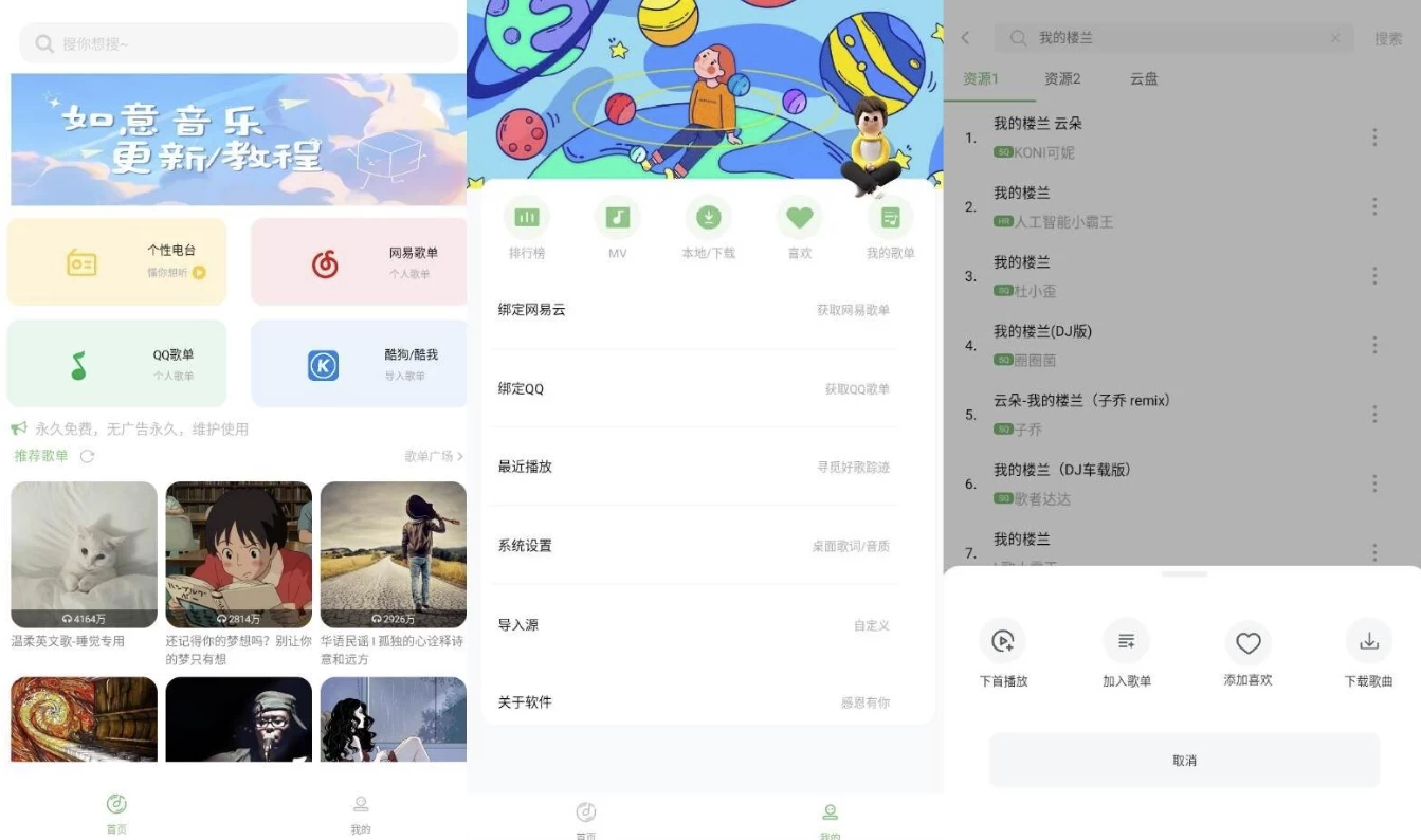 如意音乐是一款功能完善的音乐播放与下载软件,软件界面干净整洁,功能丰富,支持绑定其他平台的音乐账号或自行导入准备好的插件链接。