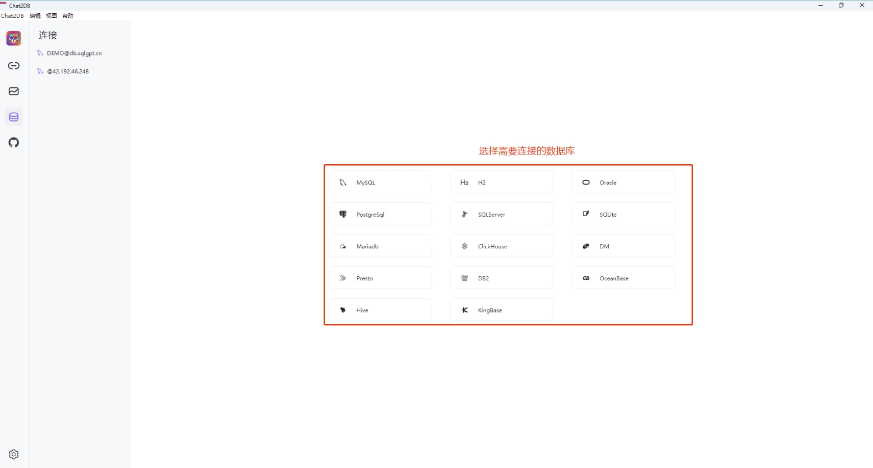 Chat2DB 是一个集成了人工智能的数据库SQL客户端和报表工具,支持 windows、mac 本地安装,也支持服务器端部署,web 网页访问。支持MySQL、Oracle、PostgreSQL、DB2、SQLServer、DB2、SQLite、H2、ClickHouse等。 Chat2DB 集成了 AIGC 的能力,能够将自然语言转换为 SQL,也可以将 SQL 转换为自然语言,可以给出研发人员 SQL 的优化建议。