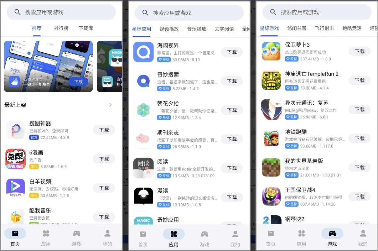 应用乐园是一款非常优质的应用下载神器,提供了最齐全的应用程序和海量的游戏资源,包括:音乐、小说、漫画、动漫、游戏、学习、办公、搜索、下载等多种类型的应用,资源即时更新,下载速度快,满足用户各方面的使用需求。