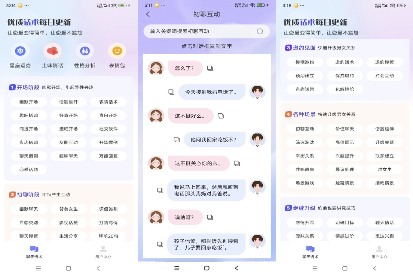 AI聊天话术凭借其强大的人工智能技术,帮助用户在沟通中轻松找到话题、化解尴尬,让聊天变得更轻松、更有趣。无论是日常社交、职场沟通还是情感交流,这款软件都能成为用户不可或缺的助手。如果你想要提升自己的沟通技巧,或者正在寻找聊天中的突破口,那么不妨下载并体验这款软件,让你的对话更加充满智慧与魅力!