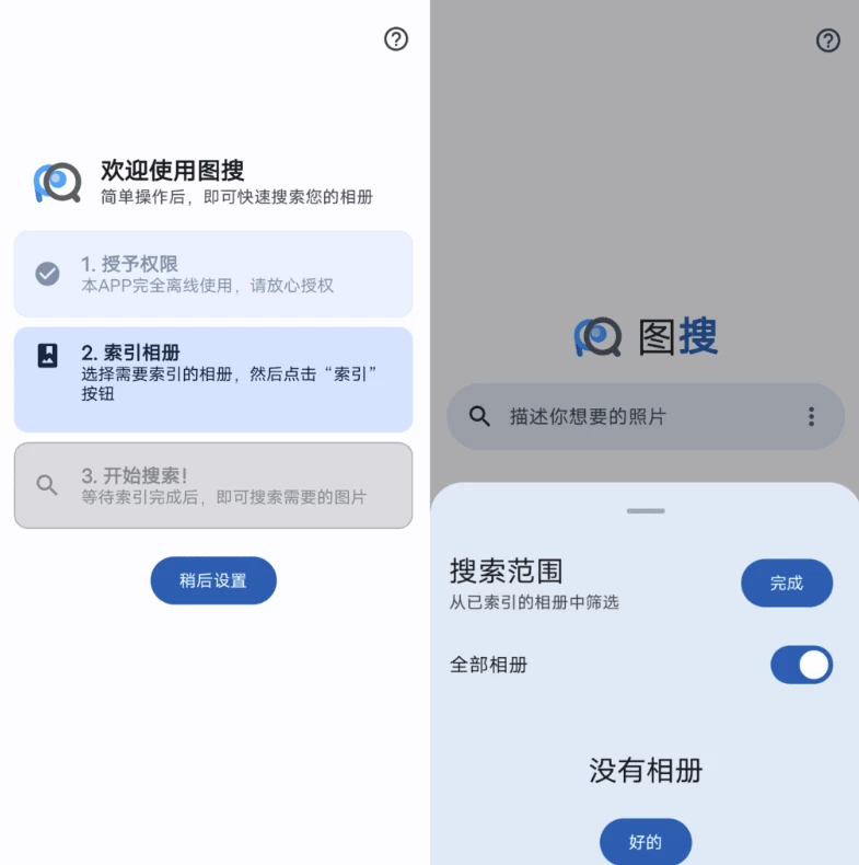 图搜PicQuery是一款本地运行无需联网的安卓本地相册图片搜索工具,借助图搜你可以通过一些常用的话语搜索出相册中符合要求的图片。