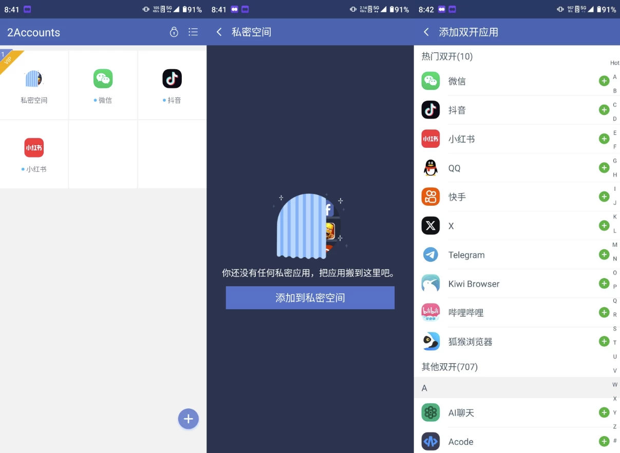 2Accounts 为你提供了一个不错的多开工具,有了这款app你手机中的各种app、游戏都可以进行双开,而且针对光遇还有各种脚本。软件使用也很简单,直接添加手机上的app到2accounts就可以直接双开了。欢迎下载!