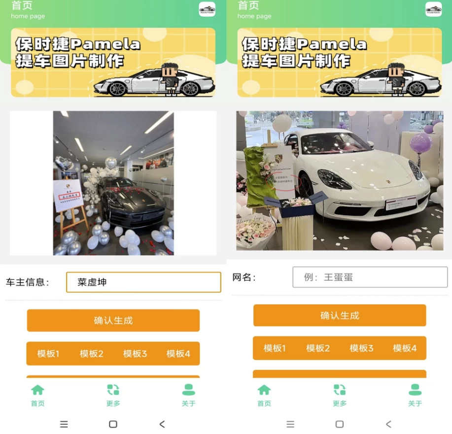 一款保时捷Pamela图片生成器APP,输入内容轻松定制你的专属保时捷汽车图片!多种风格模板可选,满足你的个性化需求,一键生成高清图片,分享到社交平台,炫耀你的个性座驾。