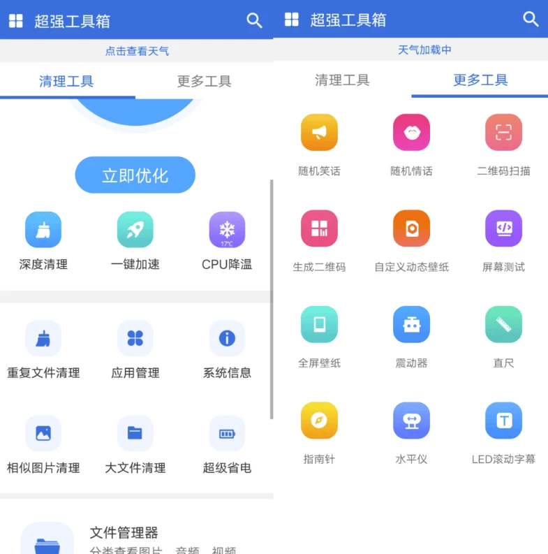 超强工具箱纯净版是一款最近非常火的常用工具类软件,这款软件中有很多非常强大的功能,用户通过这款软件可以使用到很多的小工具哦,所有的工具都可以免费使用哦,用户只需要一键点击,它会极速的帮你清理掉手机中所产生的垃圾,让手机释放更大的空间,运行起来更加的高效。快来下载超强工具箱纯净版体验吧!