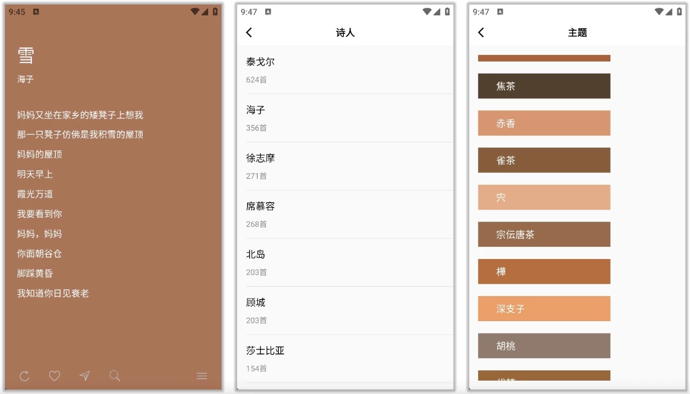 POEM是一款专为现代诗歌爱好者设计的应用程序。它以极简风格呈现,确保用户可以专注于阅读诗歌而不受干扰。支持数百个唯美主题和字体切换,提供丰富的个性化选择。软件精选了大量现代诗歌,并提供了搜索、收藏功能,以及诗人和诗集板块,涵盖中外著名诗人及其作品。底部刷新按钮可让用户轻松发现新的诗歌,还支持复制诗歌内容和保存诗歌图片。