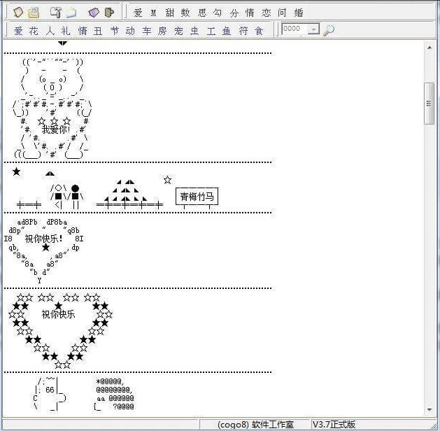 - 丰富的字符画:内置3000多个共17种字符画,完全满足您的需求,并且可以随意下载字符画扩充包
