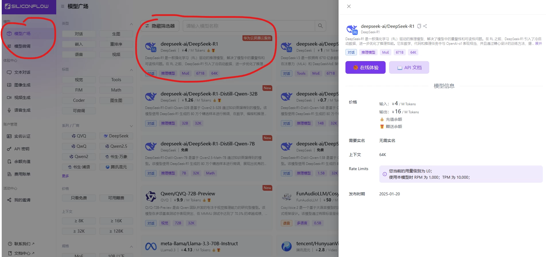 2、注册后,点击左边的模型广场,进入模型列表,选择 deepseek-R1,点击在线体验