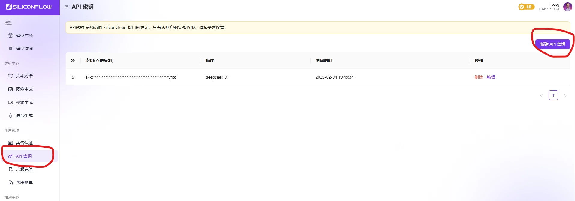 3、点击左边的API密钥,然后右上角 新建API密钥