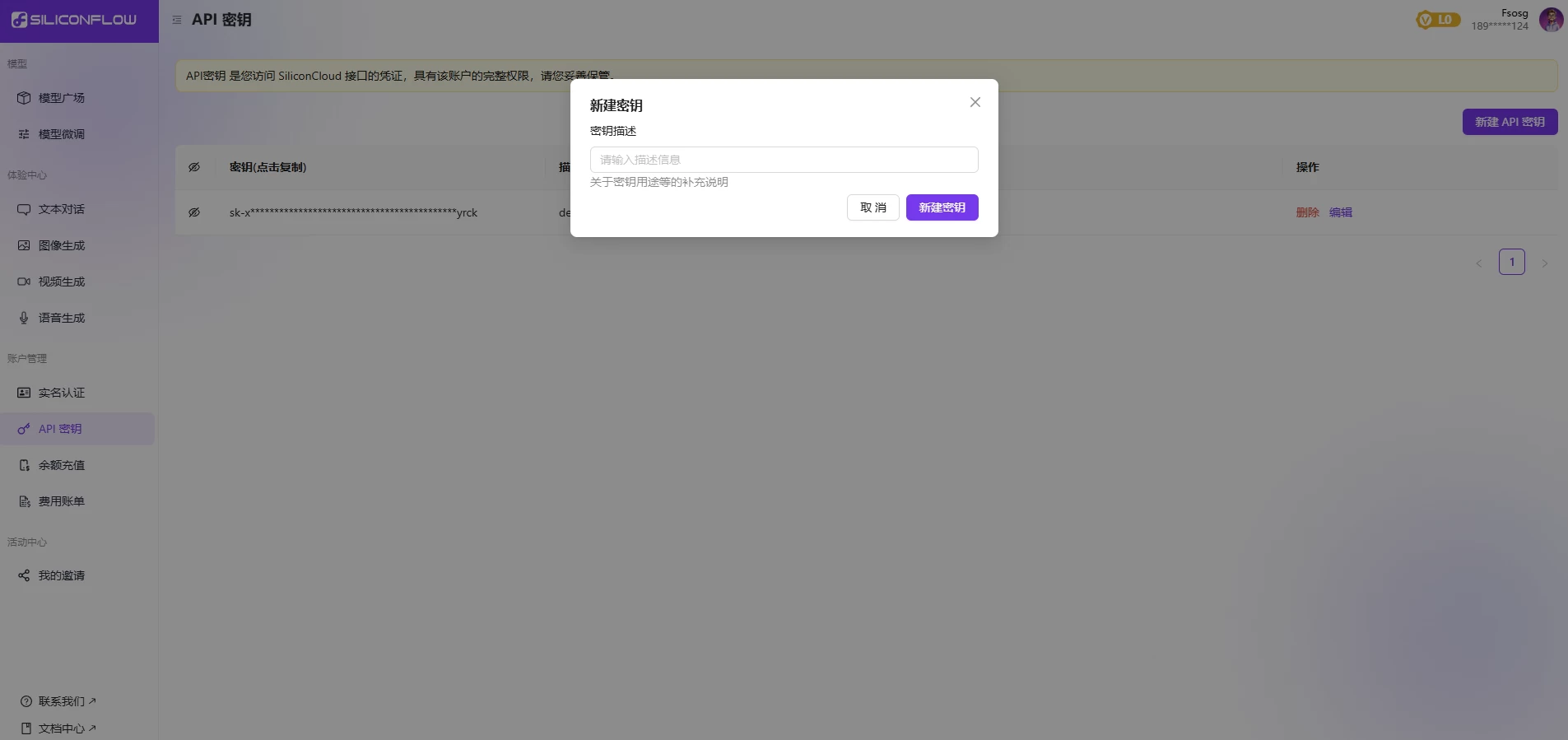 4、密钥描述随便写,然后点击 新建密钥,生成的密钥要记住,自己保存好