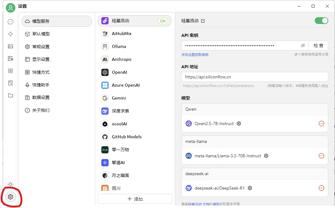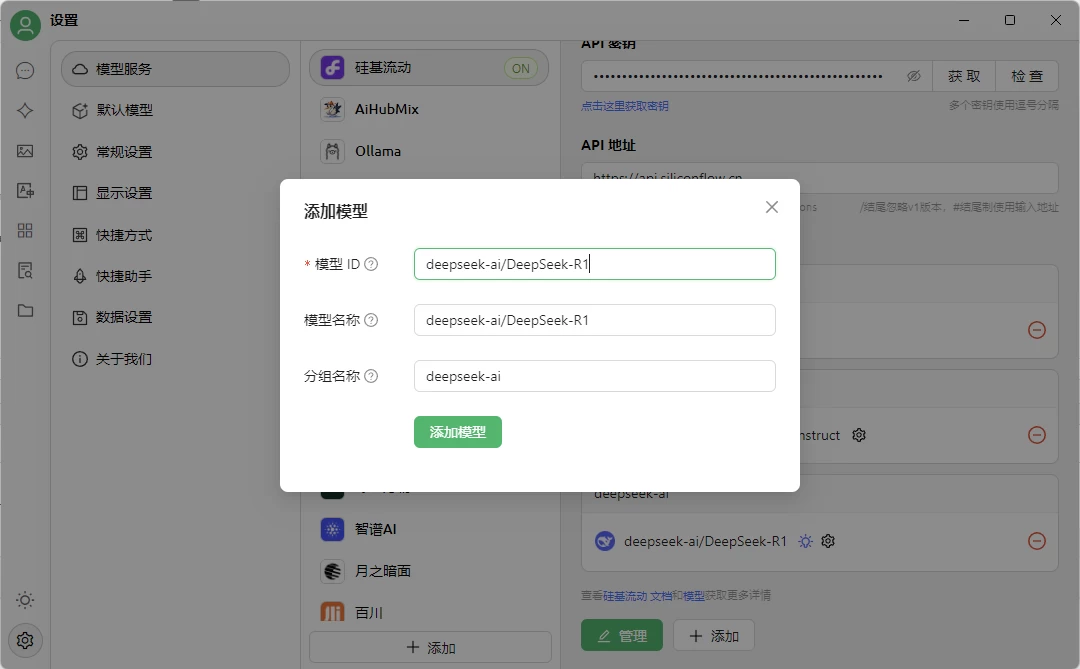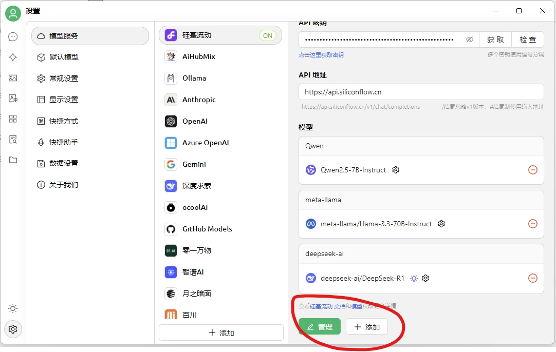 6、进入cherry studio界面,在设置里面选择硅基流动,粘贴刚才复制的密钥,然后这里他默认提供模型没有deepseek-R1,需要点击右下角的添加,如果看不到,下拉即可,然后添加R1模型