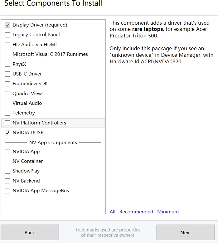 - 可以完全定制NVIDIA的驱动组件安装,PhysX物理驱动、HDMI音频驱动、虚拟音频、USB-C驱动、DLSS抗锯齿、Ansel、Optimus、nView桌面管理器、SHIELD无线手柄、NV Container、驱动更新服务、数据反馈服务、GeForce Experience等