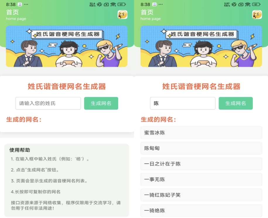 一款姓氏谐音梗网名生成器,只需输入你的姓氏,就会为你生成一系列基于姓氏谐音的搞笑网名。 这些网名风格多样,既能体现你的个性,又能让你在网络世界中脱颖而出,成为焦点!