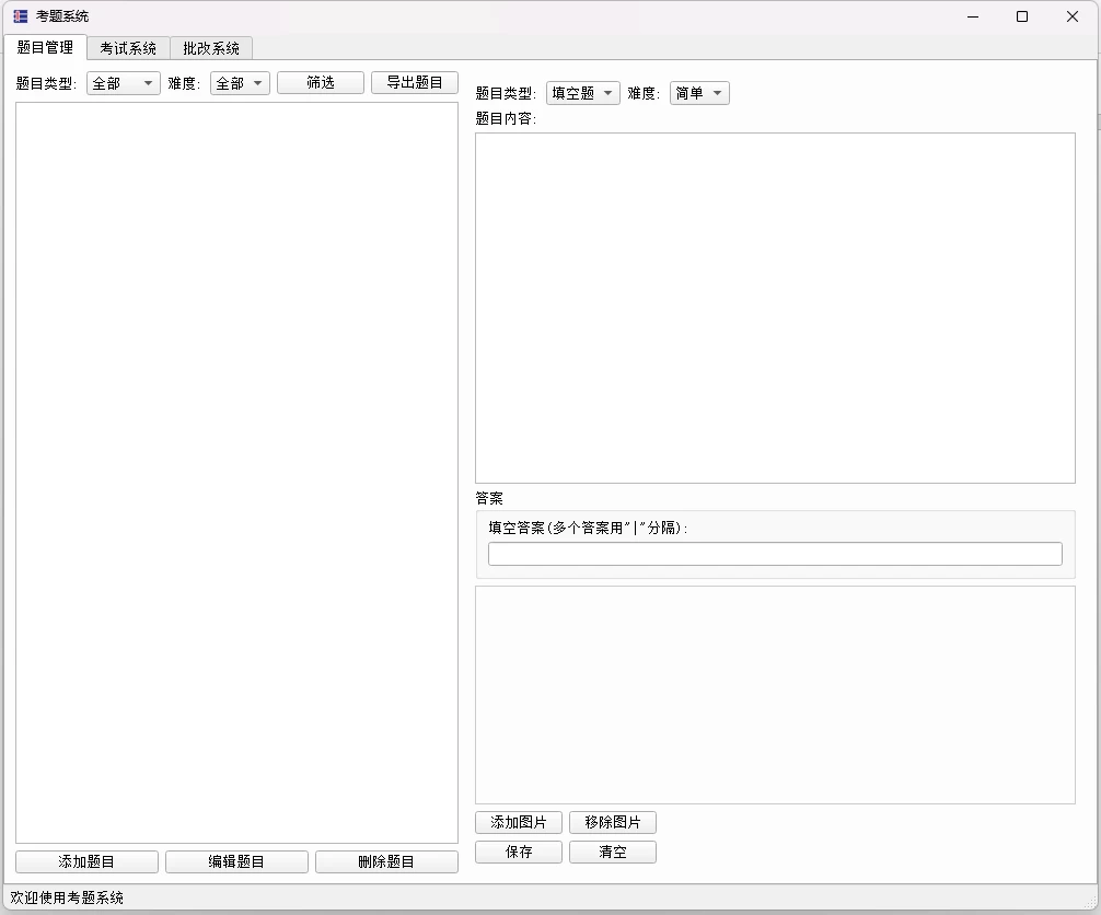 考题系统面向学生/考研/靠公/面试党,可以当作自己的错题本,记录错题,可以把考研的相关资料整理入内刷题用,双击图标运行程序,程序下会多出两个文件,一个存储数据,一个存图片。