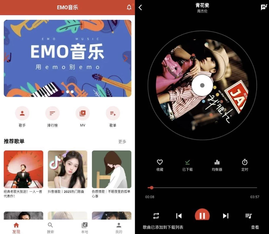 首页有推荐歌单和热门音乐版块,快捷栏有歌手、排行榜、MV、歌单等功能,支持本地导入音乐,支持设置本地下载位置。