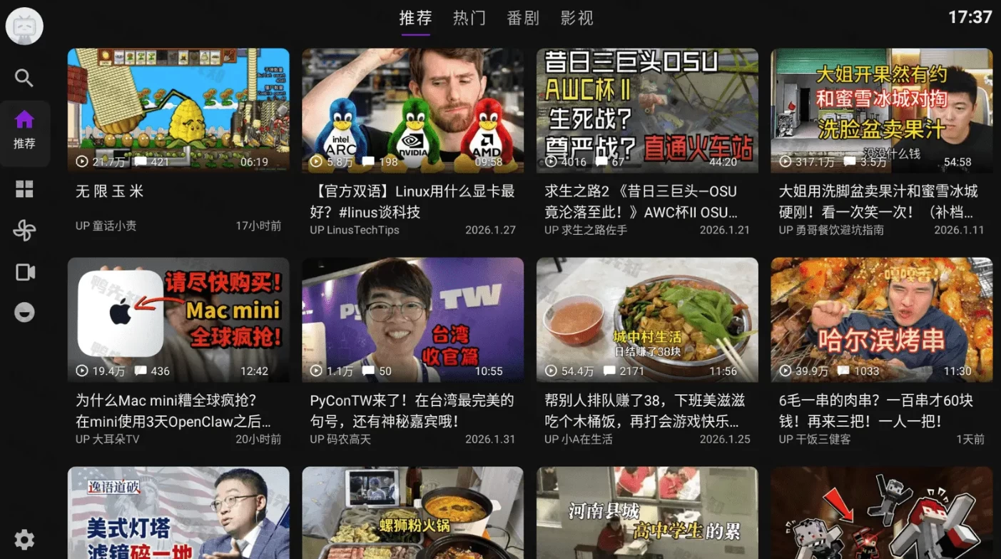 2、和ββII一样也是侧边栏导航,简洁高效;目前整合了六大核心入口,搜索 / 推荐 / 分类 / 动态 / 直播 / 我的,基本上是覆盖了日常刷b站的全场景需求。平板横屏、TV大屏显示更清晰,遥控操作也能精准切换。