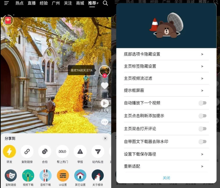 功能:防烧屏,全屏模式,自动播放,禁止点赞,全屏显文案,视频过滤,自定义顶栏标签等;