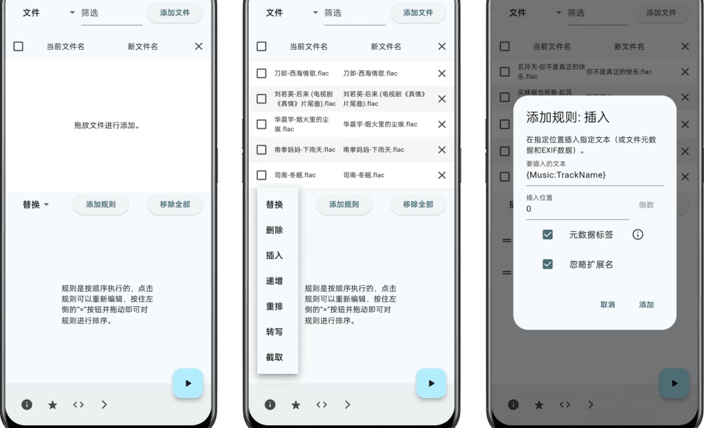- 内置多种重命名方式,包括:文本插入、替换、删除和重新排列等,支持正则表达式、