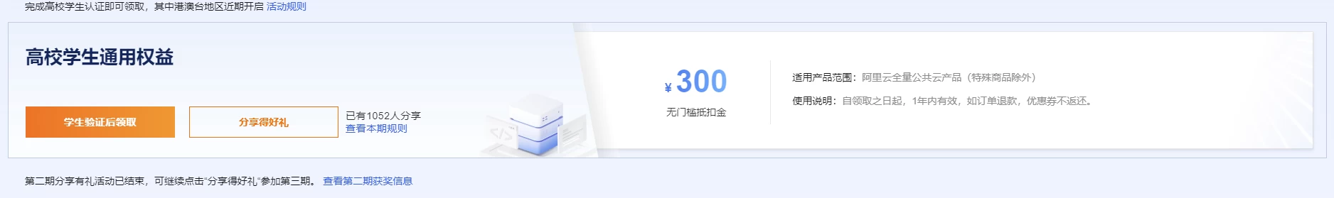 然后,完成大学生认证免费领取到一张300元无门槛券,可以购买阿里云的产品无门槛使用,国内的服务器价格贵且需要备案,我们购买国外的服务器,可以购买1年左右,具体还是要看配置。
